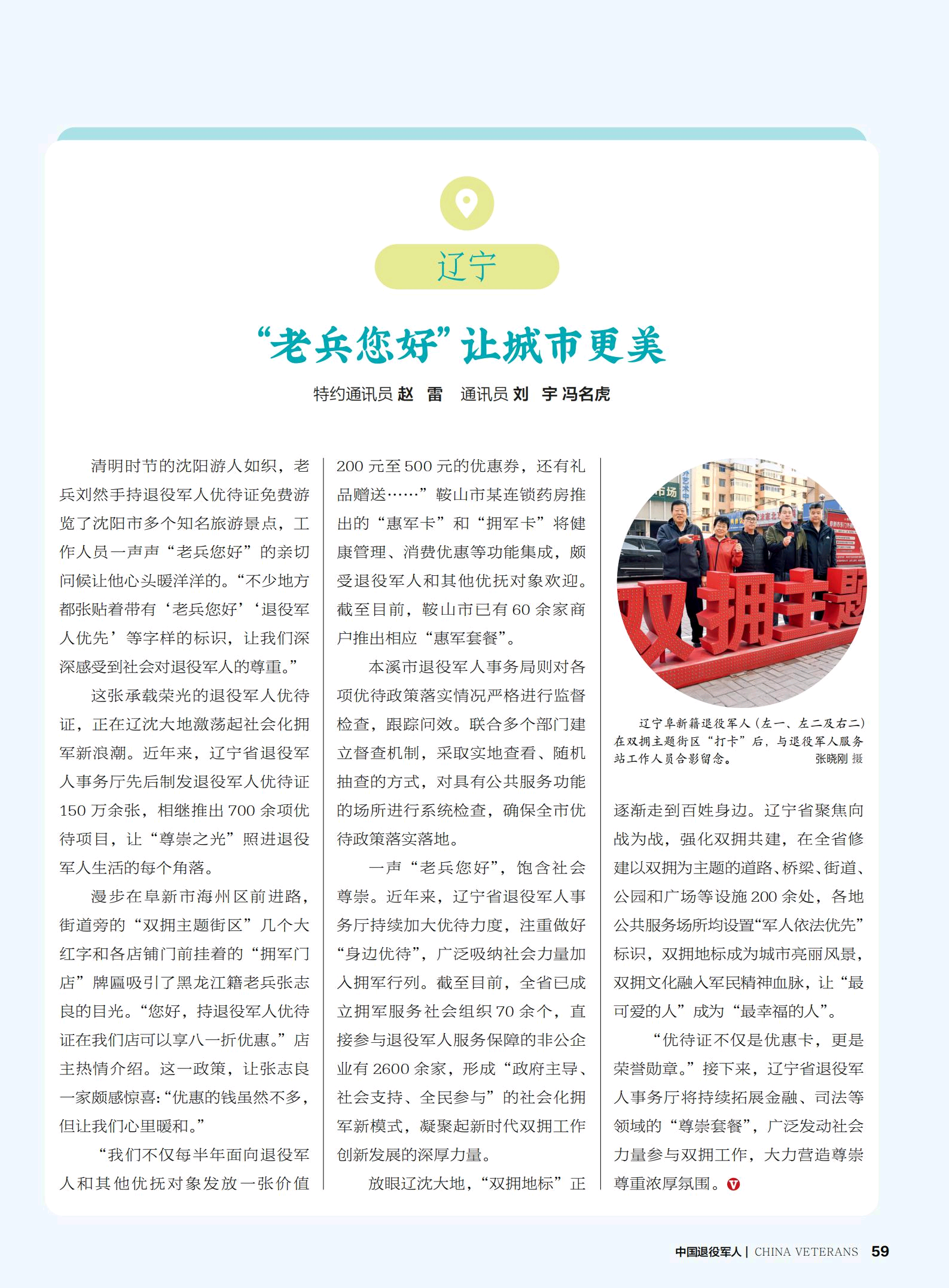 清明时节的沈阳游人如织,老兵刘然手持退役军人优待证免费游览了沈阳市多个知名旅游景点,工作人员一声声“老兵您好”的亲切问候让他心头暖洋洋的。“不少地方都张贴着带有‘老兵您好’‘退役军人优先’等字样的标识,让我们深深感受到社会对退役军人的尊重。”