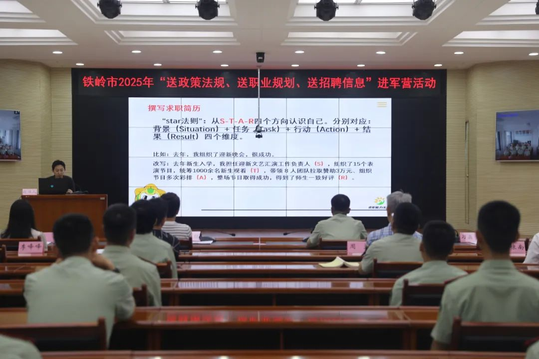 为积极践行“让军人成为全社会尊崇的职业”使命,近日,铁岭市退役军人事务局携手市人社局社保中心、人力中心工作人员走进武警铁岭支队,开展“送政策法规、送职业规划、送招聘信息”进军营活动,主动靠前服务,精准对接需求,全力帮助即将退役的部队官兵顺利实现角色转换和职业转型。