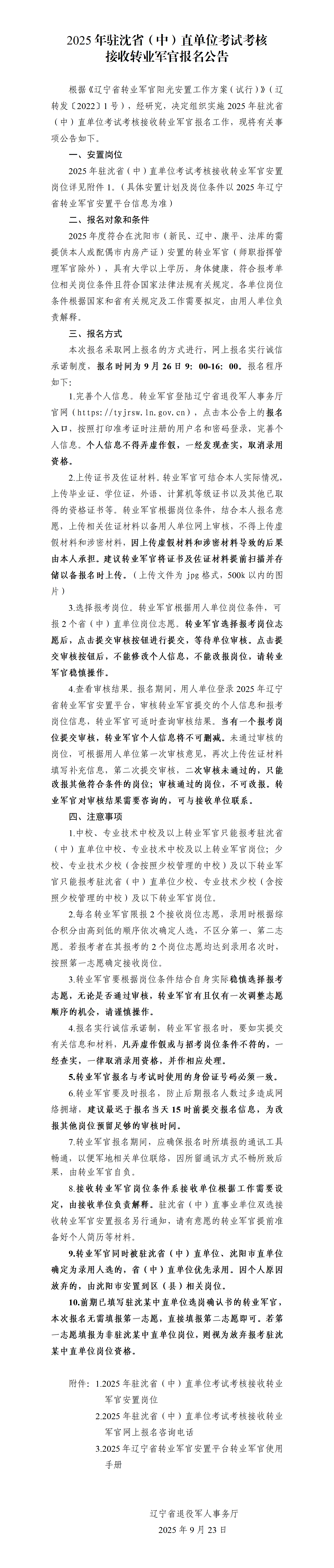 2025年驻沈省(中)直单位考试考核接收转业军官报名公告