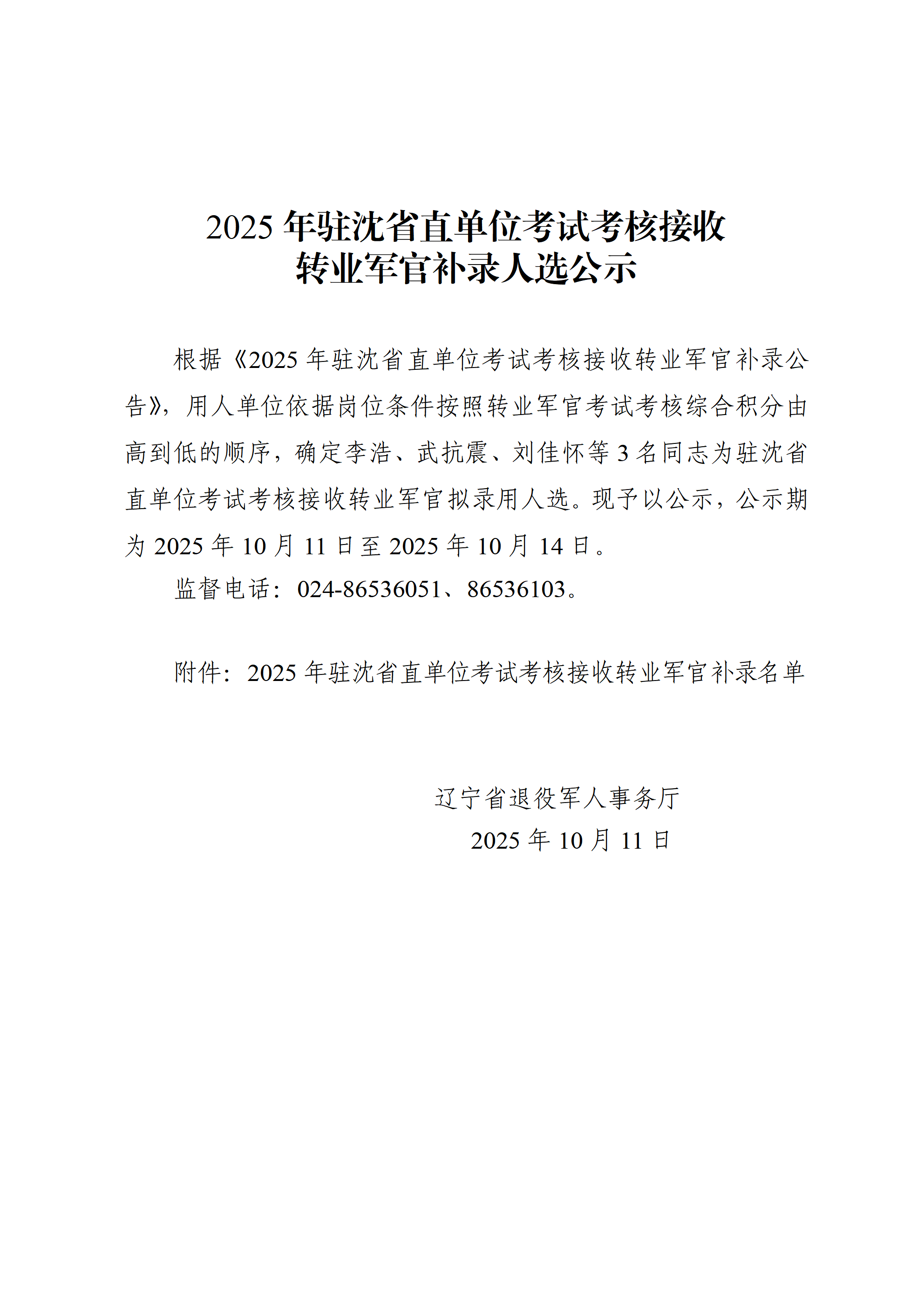 2025年驻沈省直单位考试考核接收转业军官补录人选公示